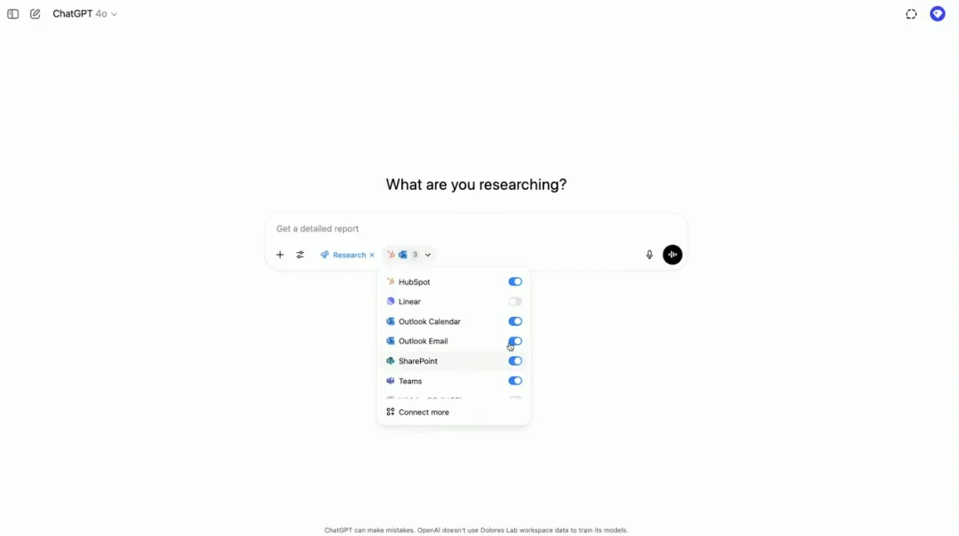结合深度研究功能,新发布的「连接器」功能将可以打通 GitHub、Google Drive、SharePoint、Teams、Dropbox、Outlook 等多个企业常用平台,实现无缝对接。