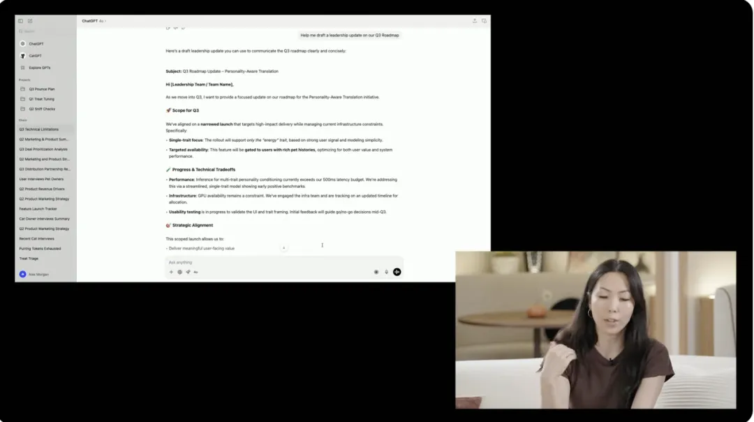 举例而言,在凌晨召开的直播演示中,产品经理想如果了解产品的日活(DAU)和用户反馈,只需要交给 ChatGPT,模型就能自动调取资料、总结痛点,并按优先级排好队,直接变成季度规划文档。